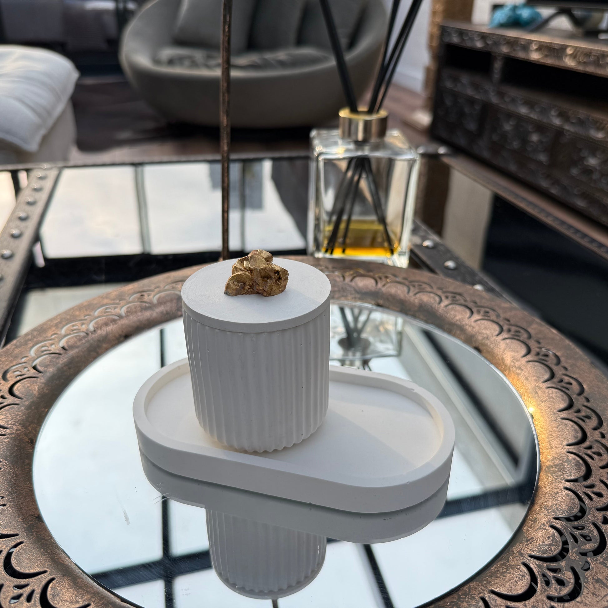 - Housed in unique handmade concrete holders, each with its own texture and tone