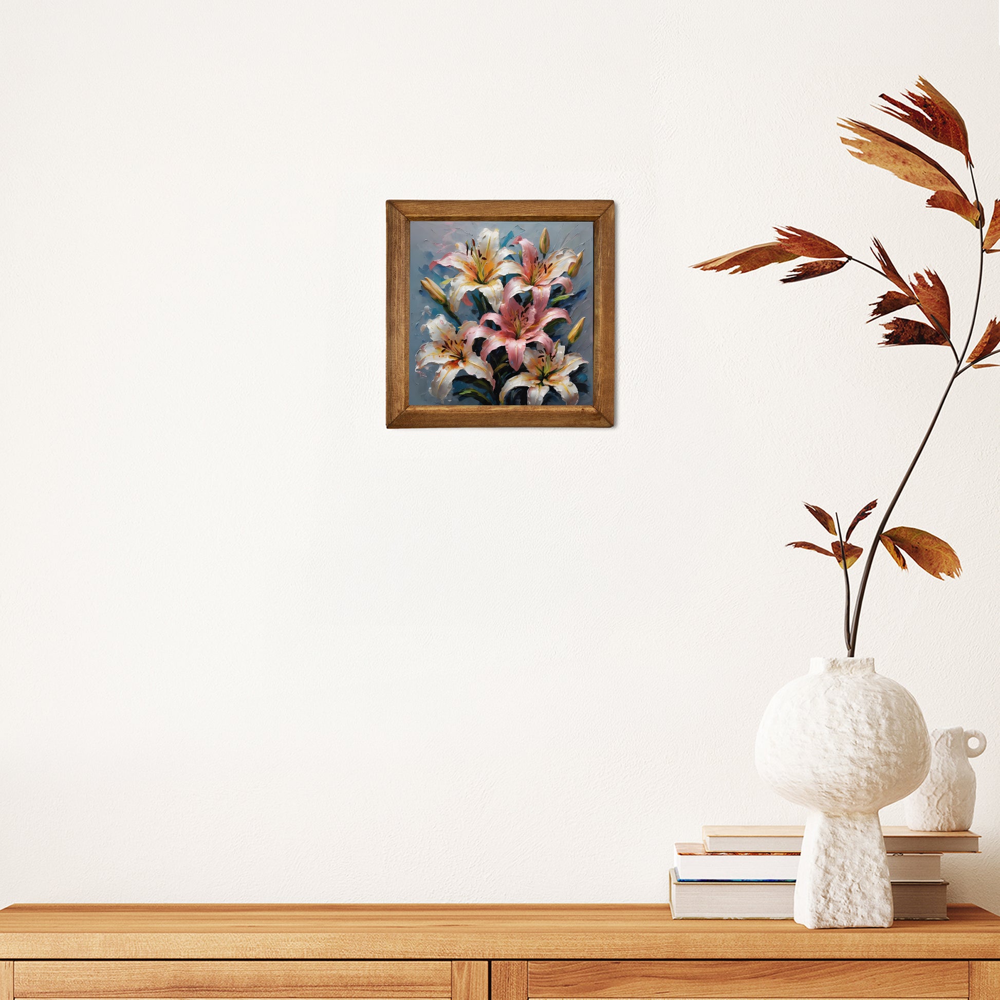 Featuring a graceful arrangement of blooming lilies, this handmade wall art brings softness, freshness, and floral charm into the home. The natural stone surface adds a refined organic texture that complements the gentle pink, ivory, and blue palette, making it especially suited to airy bedrooms, elegant hallways, or thoughtfully styled living spaces. A beautiful choice for those seeking floral wall décor with a lighter, uplifting feel.